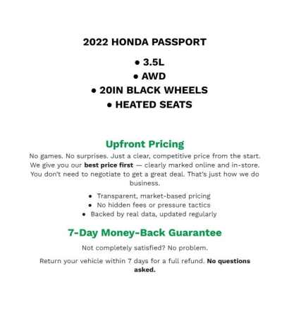 Description: Recent Arrival! 2022 Honda Passport EX-L Radiant Red Metallic II AWD 3.5L V6 24V SOHC i-VTEC4-Wheel Disc Brakes, 4.334 Axle Ratio, 7 Speakers, A/V remote CabinControl, ABS brakes, Air Conditioning, Alloy wheels, AM/FM radio SiriusXM, Apple CarPlay/Android Auto, Auto High-beam Headlights, Auto-dimming Rear-View mirror, Automatic temperature control,...Features:- - 7 Speakers